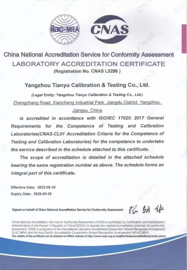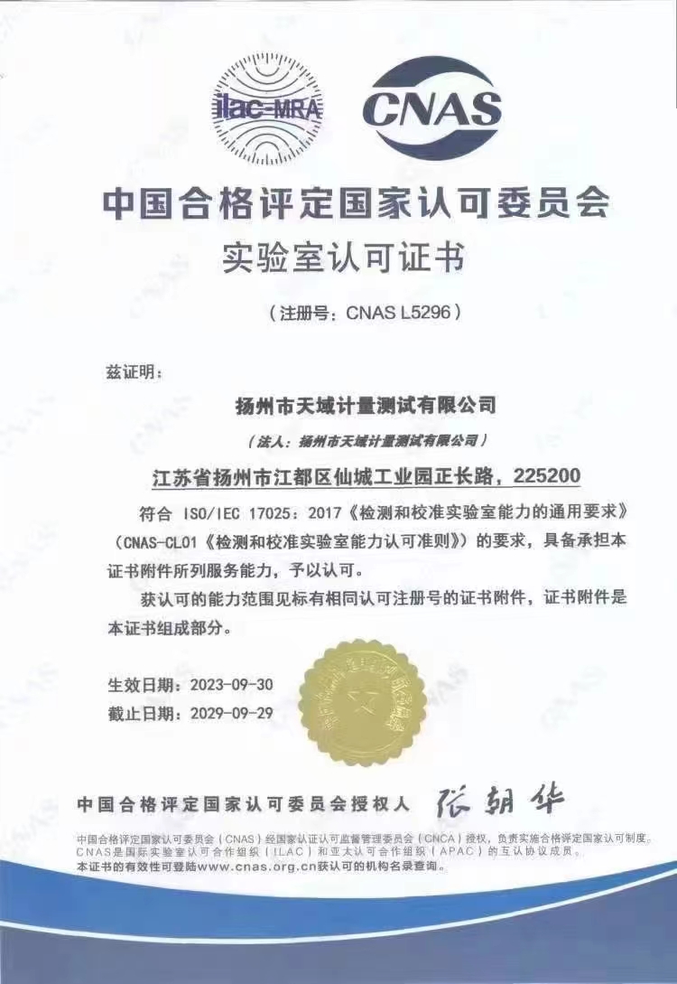 揚州市天域計量測試有限公司,坐落在交通便利的揚州市江都區(qū)仙城工業(yè)園,成立于2010年10月,2011年11月正式獲取中國合格評定國家認(rèn)可委員會認(rèn)可(授權(quán)),注冊號:CNAS L5296。近幾年的發(fā)展,實驗室已具備了較大規(guī)模,并形成了集計量器具檢測,計量技術(shù)咨詢和計量器具銷售為一體的專業(yè)化技術(shù)機(jī)構(gòu),客戶覆蓋蘇南、蘇北、和浙江,安徽部分地區(qū),客戶群總量達(dá)到了上千家企事業(yè)單位。實驗室建立健全了一套較為完整的內(nèi)外部質(zhì)量管理體系,至今未發(fā)生糾紛和客戶投訴事件。